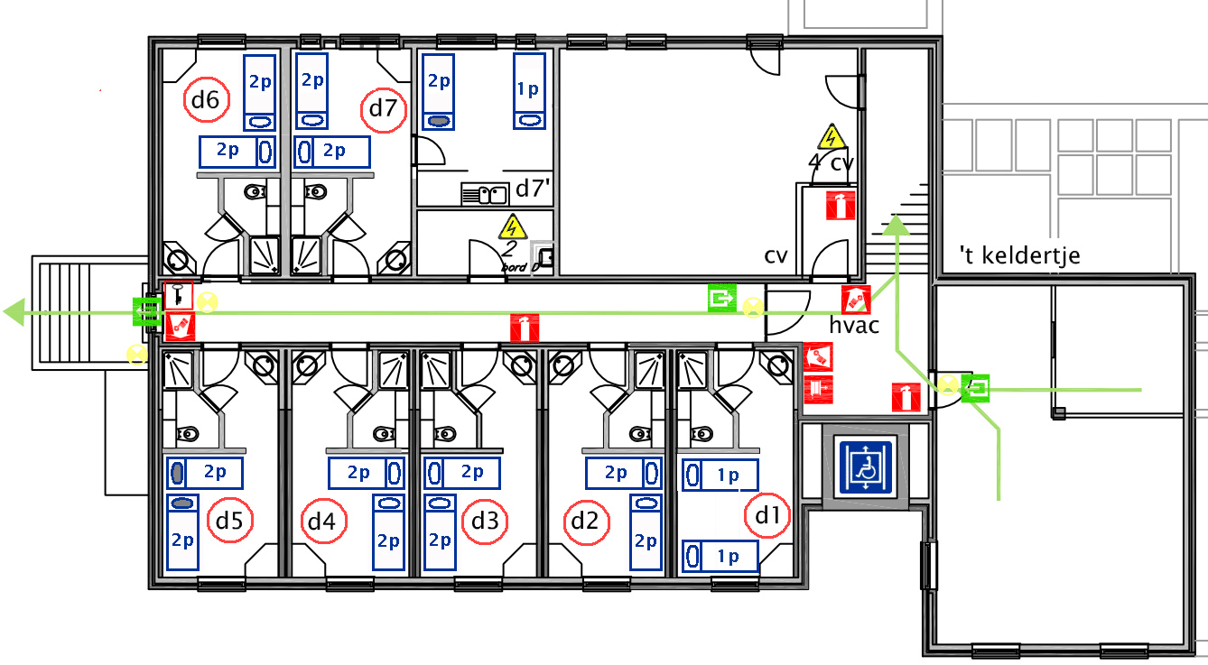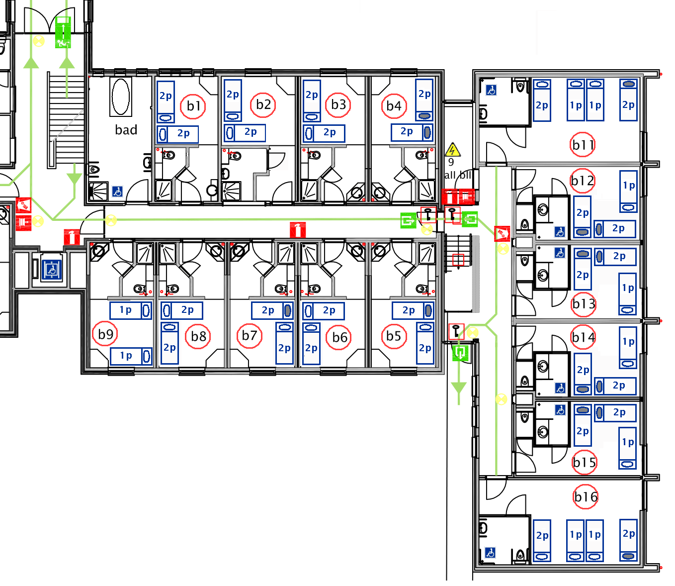• Slaapvleugel B heeft 15 kamers met 64 bedden.